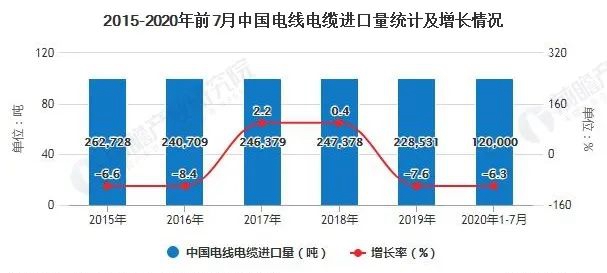 2015-2019年5年間我國電線電纜進(jìn)口量從26萬噸降至23萬噸,截止至2020年1-7月進(jìn)口量為12噸,同比下降6.3%,隨著行業(yè)進(jìn)口量的進(jìn)一步下降,電線電纜將迎來新的發(fā)展。