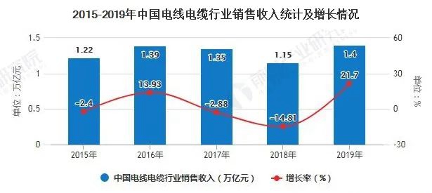 數(shù)據(jù)顯示,2015-2019年我國電線電纜銷售收入總體呈增長態(tài)勢,2019年中國電線電纜行業(yè)銷售收入達(dá)到1.4萬億元,同比增長21.70%。隨著電線電纜行業(yè)規(guī)模將不斷增加,電線電纜市場發(fā)展前景廣闊。
